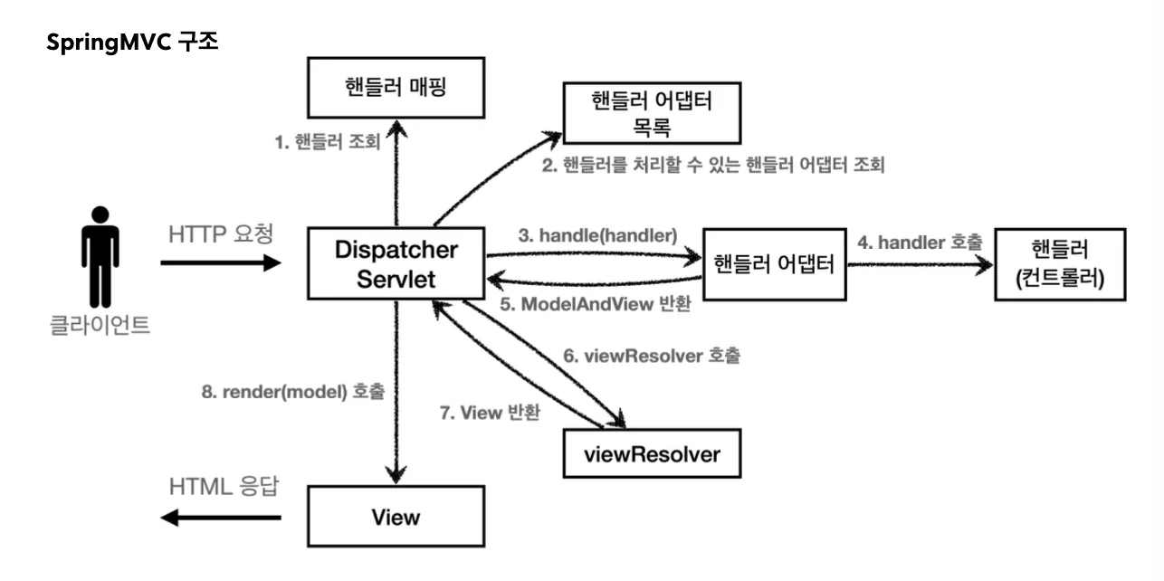 더보기protected void doDispatch(HttpServletRequest request, HttpServletResponse response) throws Exception { HttpServletRequest processedRequest = request; HandlerExecutionChain mappedHandler = null; boolean multipartRequestParsed = false; WebAsyncManager asyncManager = WebAsyncUtils.getAsyncManager(request); try { try { ModelAndView mv = null; Exception dispatchException = null; try { processedRequest = this.checkMultipart(request); multipartRequestParsed = processedRequest != request; // 1. 핸들러 조회 mappedHandler = this.getHandler(processedRequest); if (mappedHandler == null) { this.noHandlerFound(processedRequest, response); return; } // 2. 핸들러 어댑터 조회 - 핸들러를 처리할 수 있는 어댑터 HandlerAdapter ha = this.getHandlerAdapter(mappedHandler.getHandler()); String method = request.getMethod(); boolean isGet = HttpMethod.GET.matches(method); if (isGet || HttpMethod.HEAD.matches(method)) { long lastModified = ha.getLastModified(request, mappedHandler.getHandler()); if ((new ServletWebRequest(request, response)).checkNotModified(lastModified) && isGet) { return; } } if (!mappedHandler.applyPreHandle(processedRequest, response)) { return; } // 3. 핸들러 어댑터 실행 -> 4. 핸들러 어댑터를 통해 핸들러 실행 -> 5. ModelAndView 반환 mv = ha.handle(processedRequest, response, mappedHandler.getHandler()); if (asyncManager.isConcurrentHandlingStarted()) { return; } this.applyDefaultViewName(processedRequest, mv); mappedHandler.applyPostHandle(processedRequest, response, mv); } catch (Exception ex) { dispatchException = ex; } catch (Throwable err) { dispatchException = new ServletException("Handler dispatch failed: " + String.valueOf(err), err); } this.processDispatchResult(processedRequest, response, mappedHandler, mv, dispatchException); } catch (Exception ex) { triggerAfterCompletion(processedRequest, response, mappedHandler, ex); } catch (Throwable err) { triggerAfterCompletion(processedRequest, response, mappedHandler, new ServletException("Handler processing failed: " + String.valueOf(err), err)); } } ... } ... private void processDispatchResult(HttpServletRequest request, HttpServletResponse response, @Nullable HandlerExecutionChain mappedHandler, @Nullable ModelAndView mv, @Nullable Exception exception) throws Exception { ... if (mv != null && !mv.wasCleared()) { // 뷰 렌더링 호출 this.render(mv, request, response); ... } else if (this.logger.isTraceEnabled()) { this.logger.trace("No view rendering, null ModelAndView returned."); } ... } ... protected void render(ModelAndView mv, HttpServletRequest request, HttpServletResponse response) throws Exception { ... View view; if (viewName != null) { // 6. 뷰 리졸버를 통해 뷰 찾기 -> 7. View 반환 view = this.resolveViewName(viewName, mv.getModelInternal(), locale, request); if (view == null) { String var10002 = mv.getViewName(); throw new ServletException("Could not resolve view with name '" + var10002 + "' in servlet with name '" + this.getServletName() + "'"); } } else { view = mv.getView(); if (view == null) { String var9 = String.valueOf(mv); throw new ServletException("ModelAndView [" + var9 + "] neither contains a view name nor a View object in servlet with name '" + this.getServletName() + "'"); } } ... try { if (mv.getStatus() != null) { request.setAttribute(View.RESPONSE_STATUS_ATTRIBUTE, mv.getStatus()); response.setStatus(mv.getStatus().value()); } // 8. 뷰 랜더링 view.render(mv.getModelInternal(), request, response); } catch (Exception var8) { if (this.logger.isDebugEnabled()) { this.logger.debug("Error rendering view [" + String.valueOf(view) + "]", var8); } throw var8; } }2) Spring MVC 구조