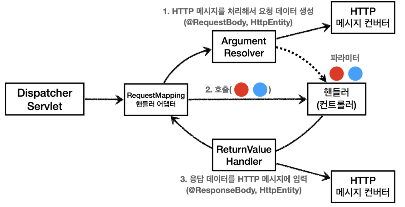 - 응답 : @ResponseBody, HttpEntity 타입의 반환값을 처리하는 ReturnValueHandler가 HTTP 메시지 컨버터를 호출해 응답 결과를 만듦