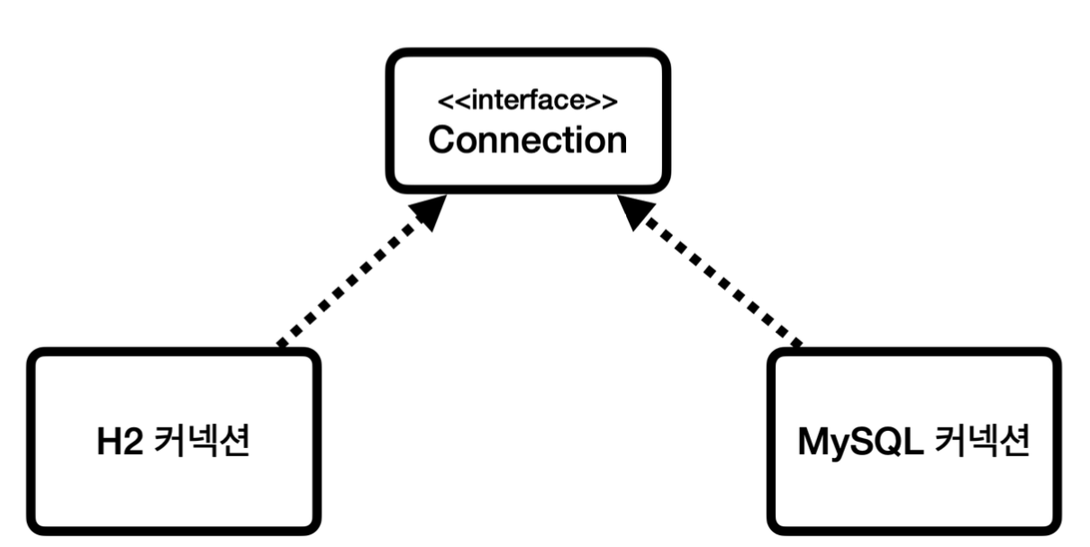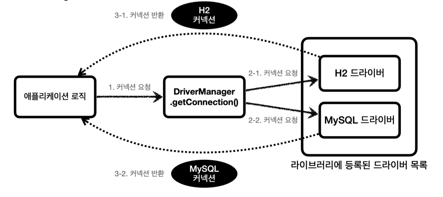 - JDBC가 제공하는 DriverManager는 라이브러리에 등록된 DB 드라이버들을 관리하고, 커넥션을 획득하는 기능을 제공함
