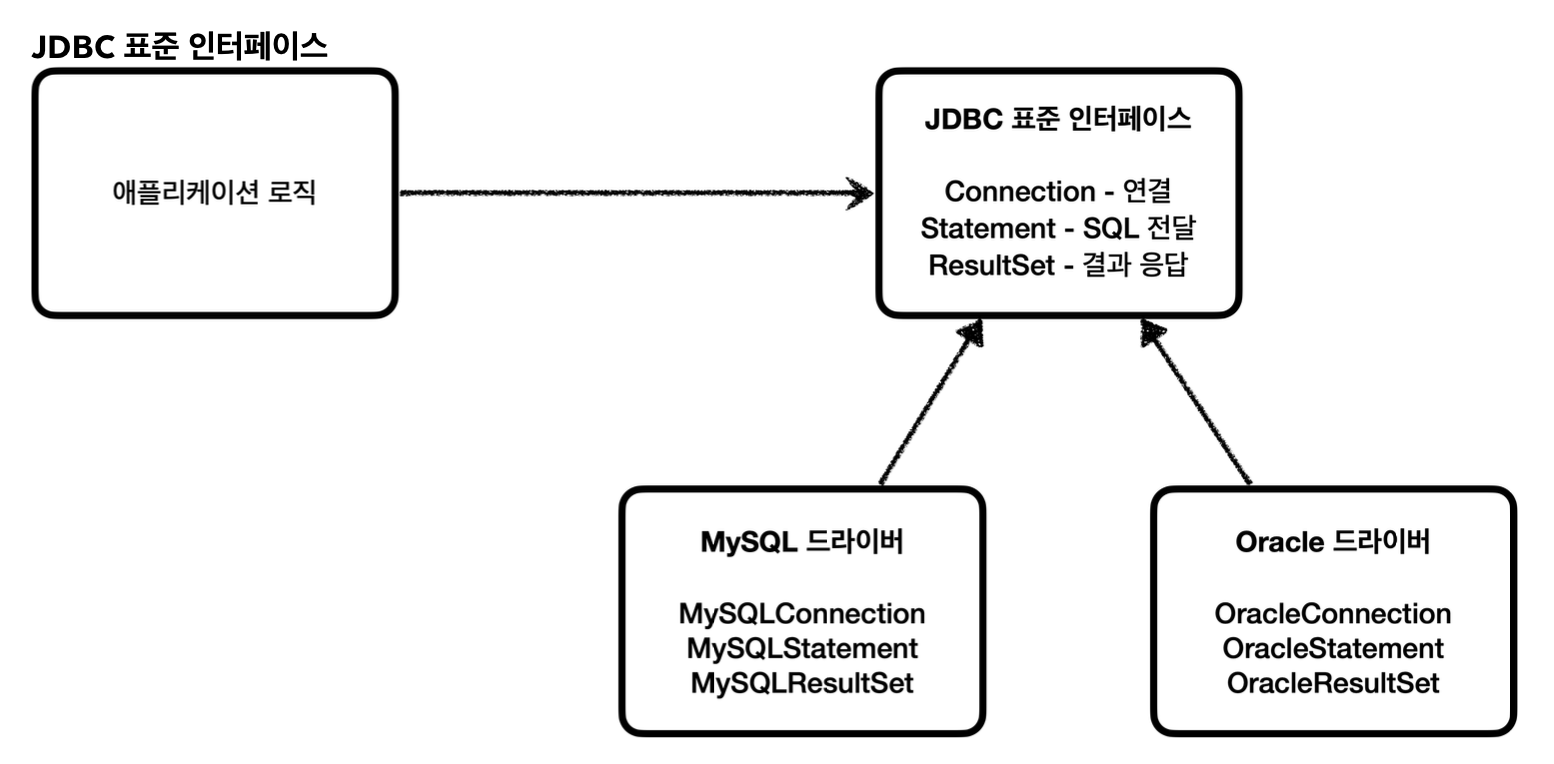 - 각각의 데이터베이스마다 커넥션을 연결하는 방법, SQL을 전달하는 방법, 결과를 응답 받는 방법이 모두 다름