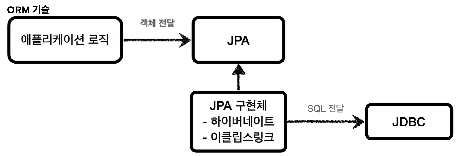 - JPA는 자바 진영의 ORM 표준 인터페이스이고, 이것을 구현한 기술로 Hibernate와 EclipseLink 등이 있음
