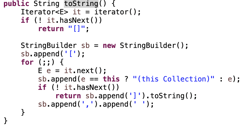 AbstractCollection 클래스의 toString() -> 오버라이딩한 메서드가 실행됨