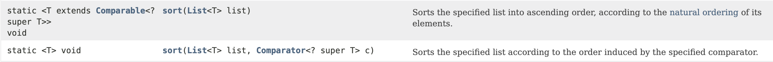 → public void sort(List<T> list, Comparator<? super T> c)를 사용하면 주어진 Comparator 인터페이스를 구현한 클래스에서 정의한 정렬 기준으로 전달된 리스트를 정렬함