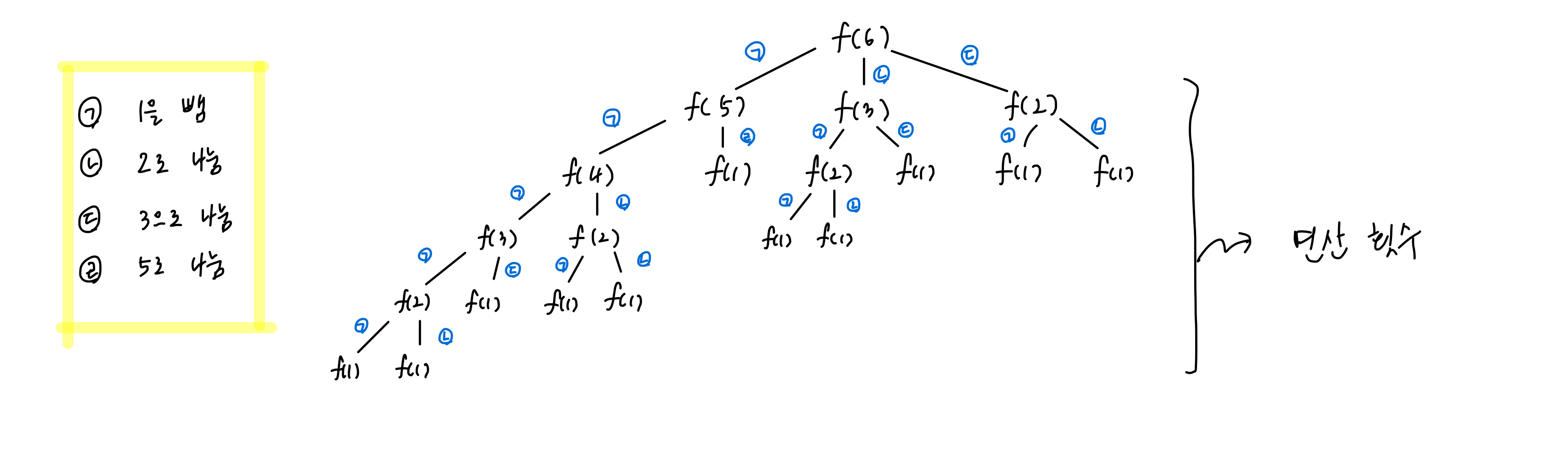 주어진 값이 6일 때 함수가 호출되는 과정(= 모든 경우의 수) → 모든 경우의 수에 대해 고려할 때 동일한 함수들이 여러 번 호출됨을 알 수 있음